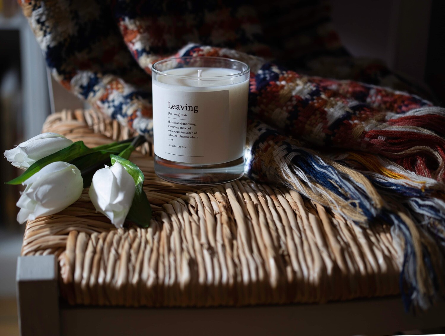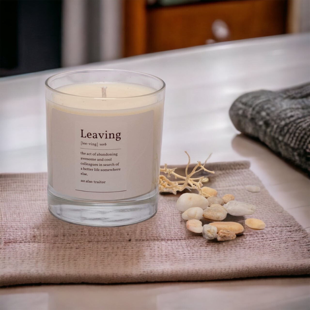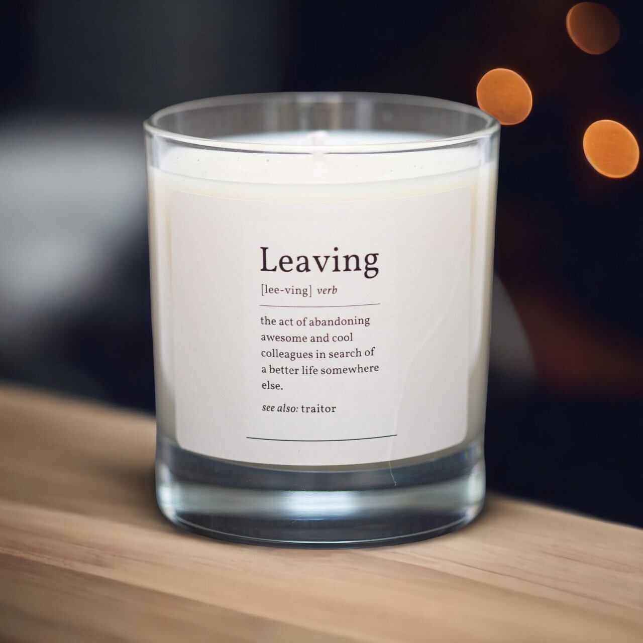Colleague leaving? Congratulate them on deserting you at work by sending them this gorgeous and funny 220g linen fresh candle sent in a plush windowed box.