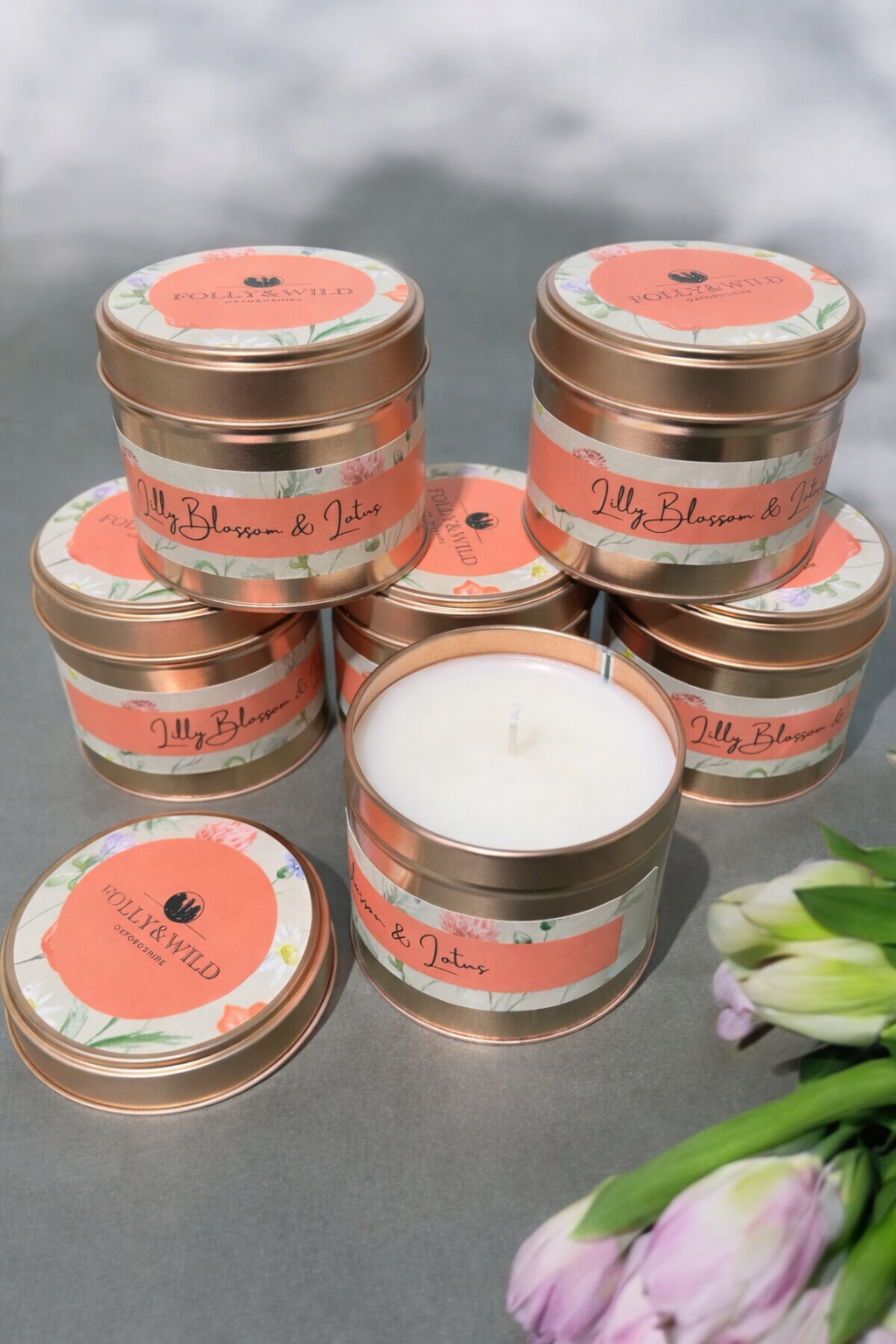 Lily blossoms & lotus flower tinned candle